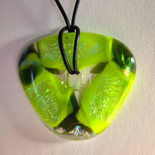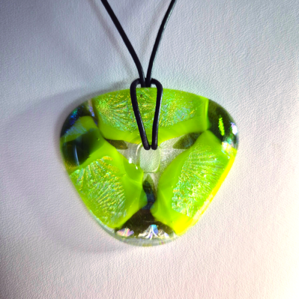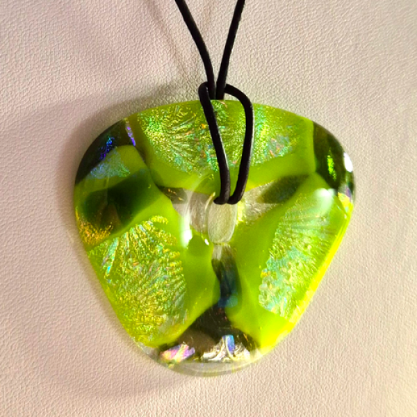 Glittrande smycke med dichroic glas som glasfusats i grön, gul, dichroic nyanser med en vårgrön bas. Smycket är helt utan metalldelar. Smycket har en storlek av ca 5 x 5,5 cm och ett justerbart läderband med löpknut. Frakt adderas i kassan. Läs mer om leveranskostnader